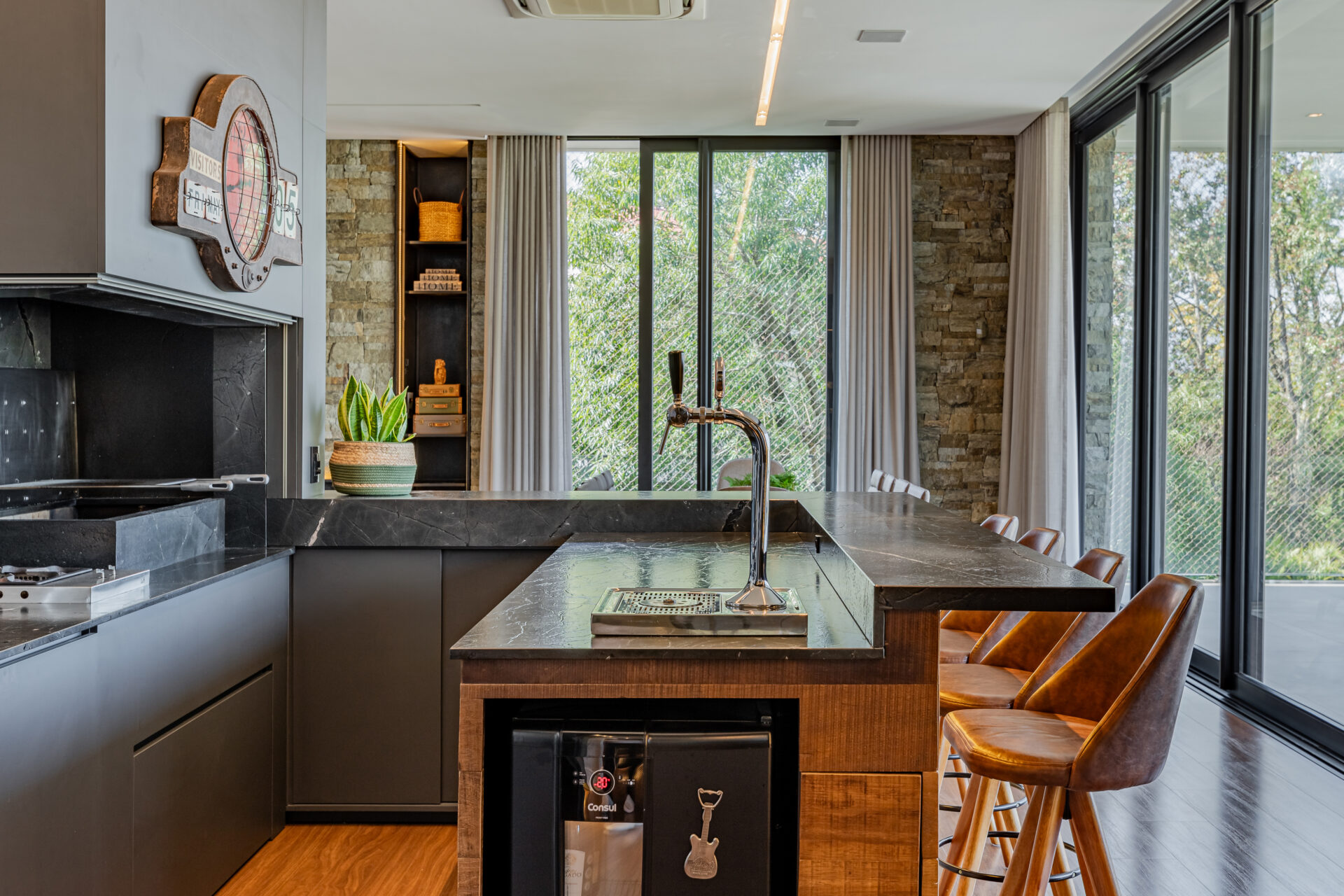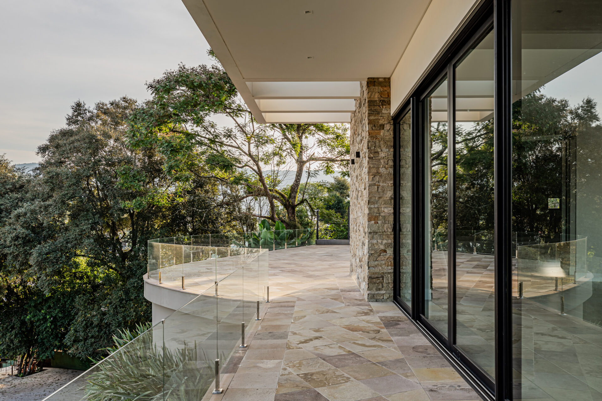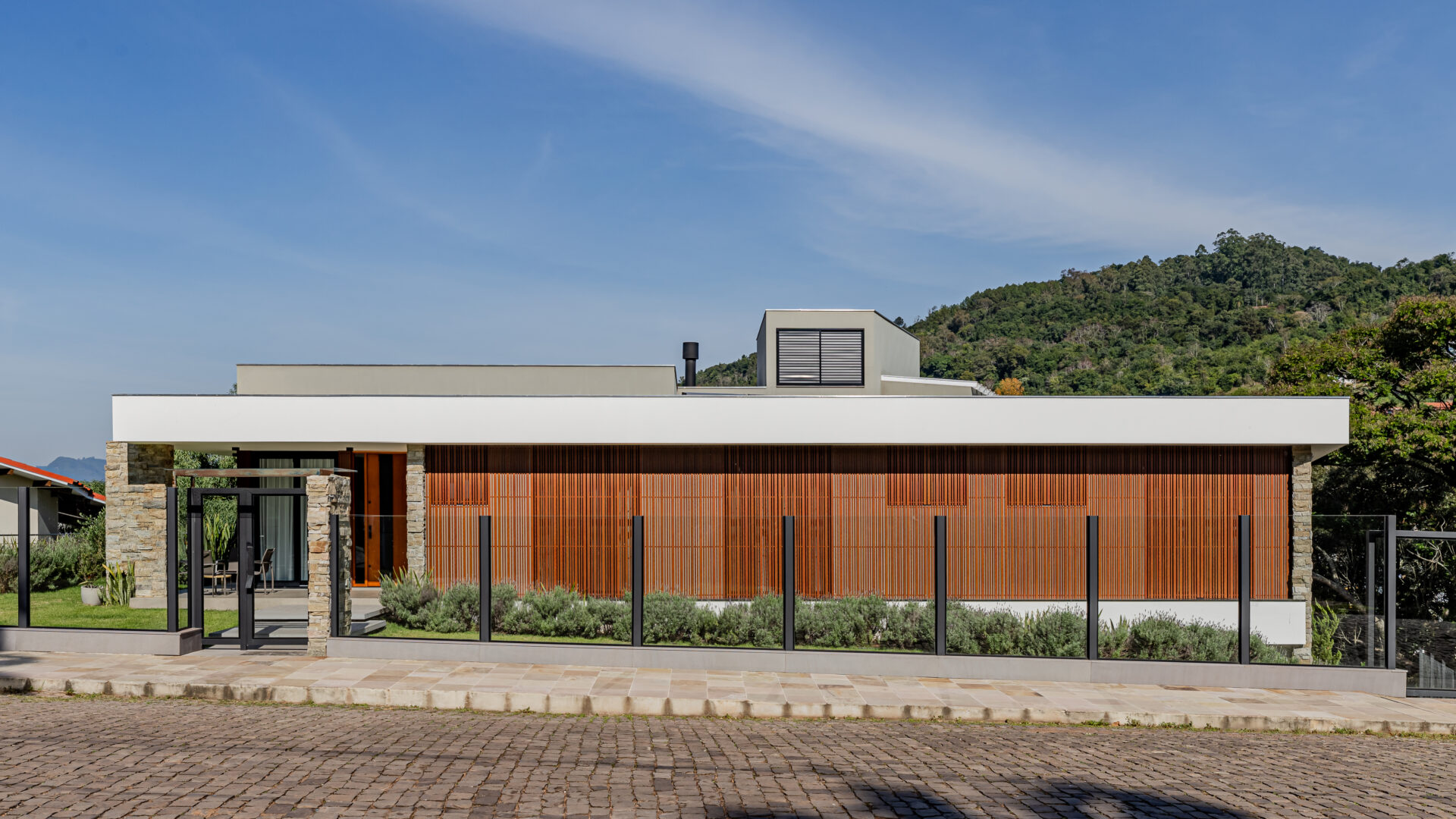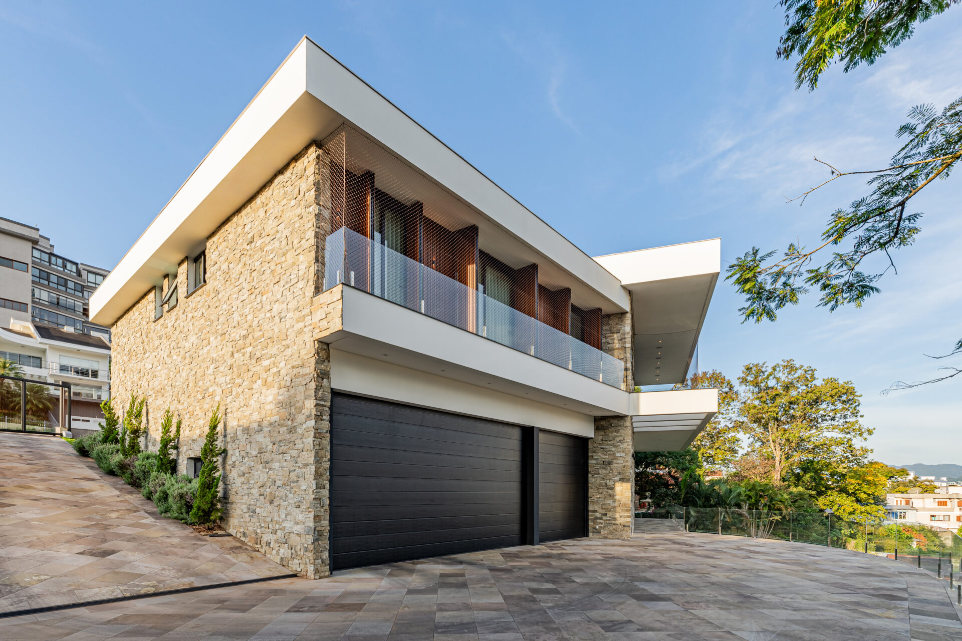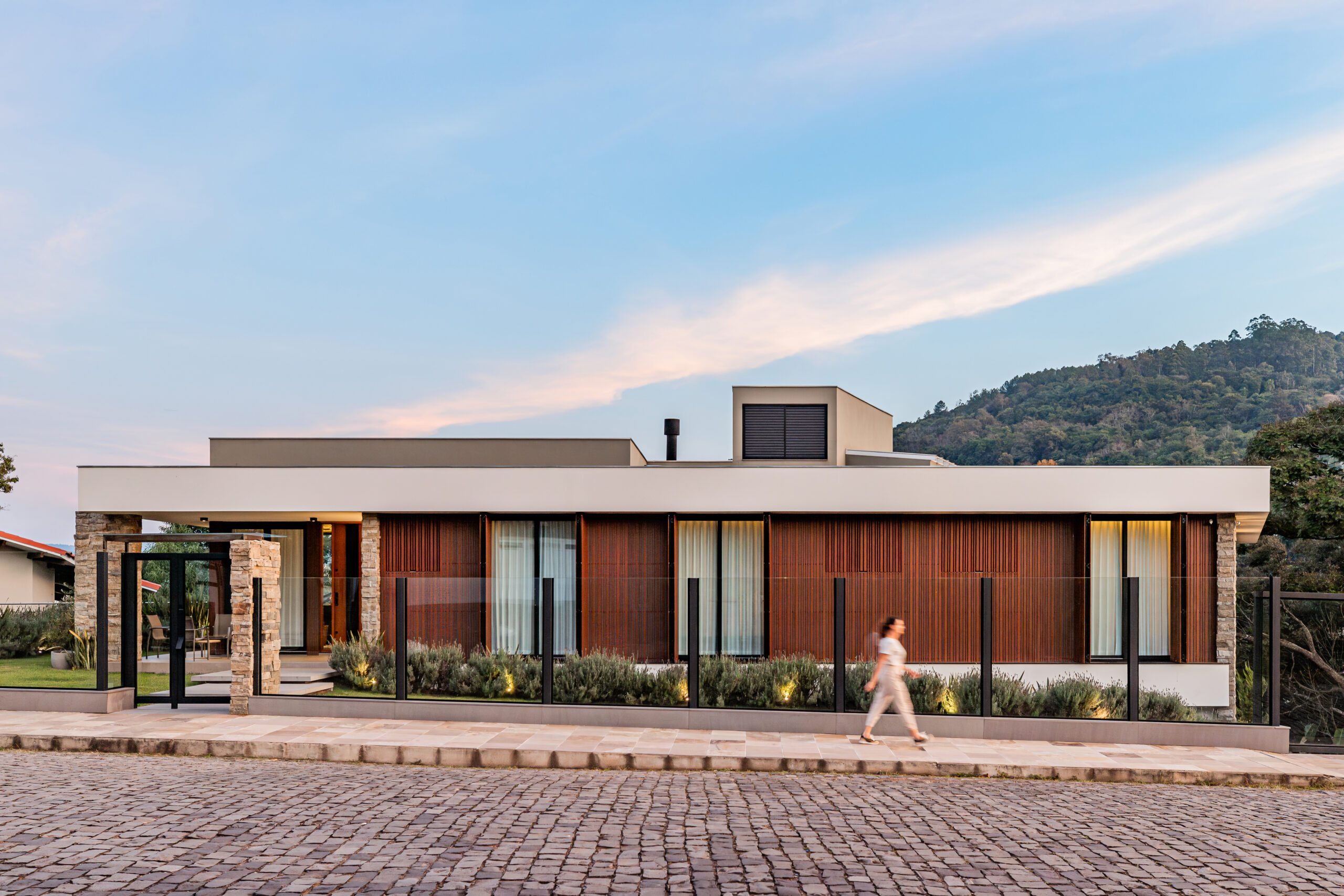 Projeto de uma casa em Encantado - RS. Solicitação de projeto para uma família com duas crianças. Em terreno bem acidentado, o desejo era ter a parte principal da casa em um único pavimento e um espaço de lazer na frente da casa.