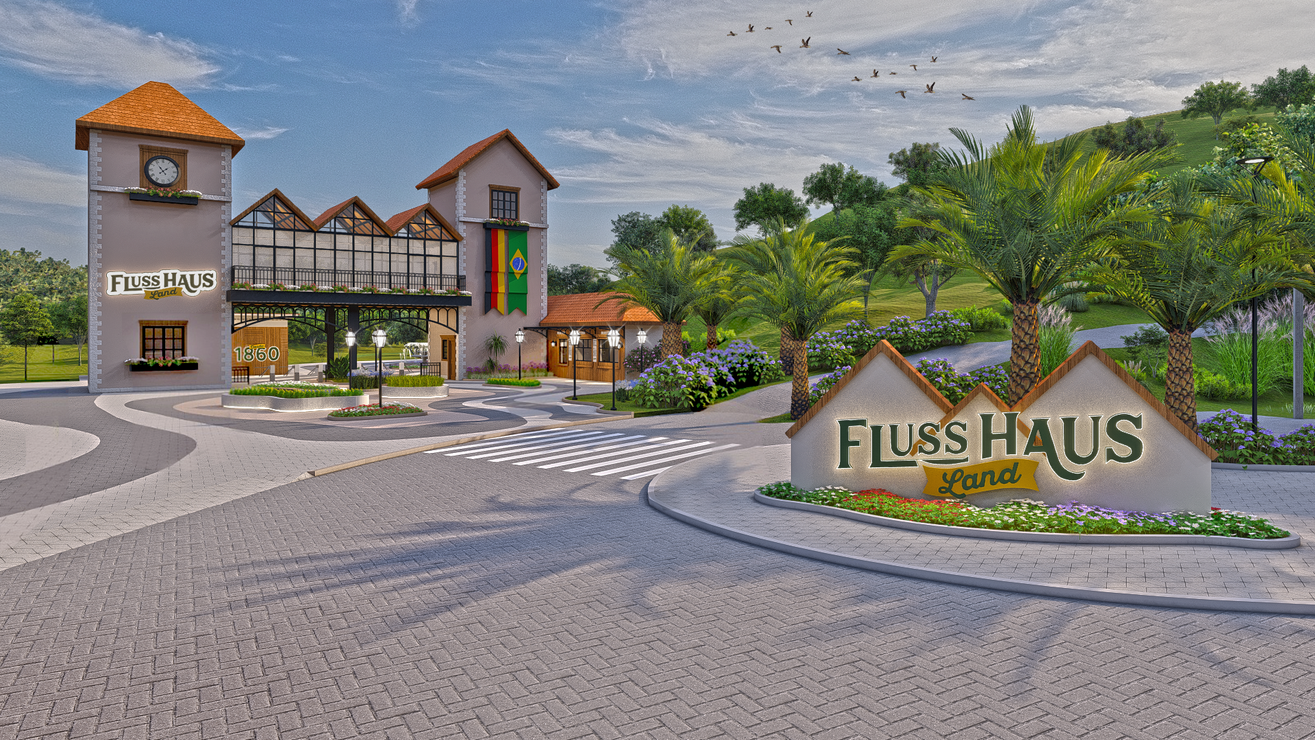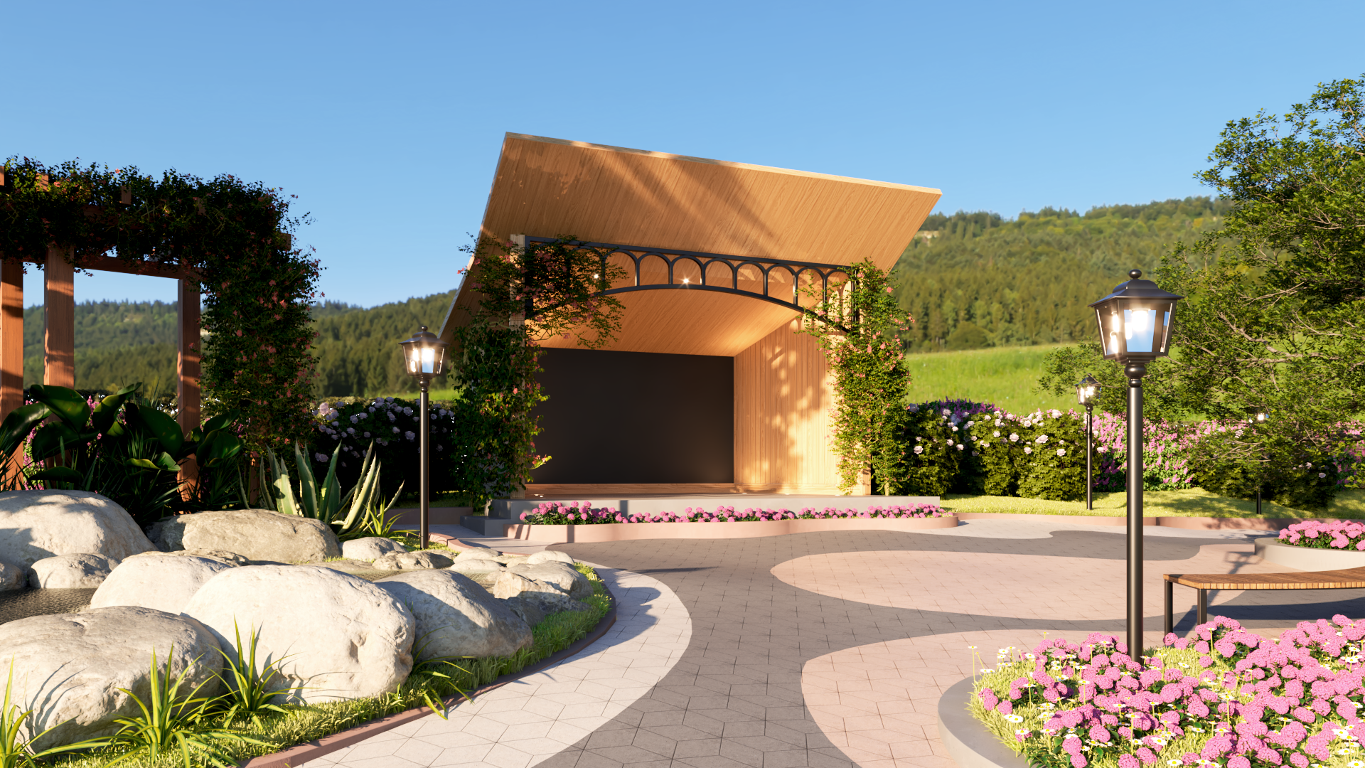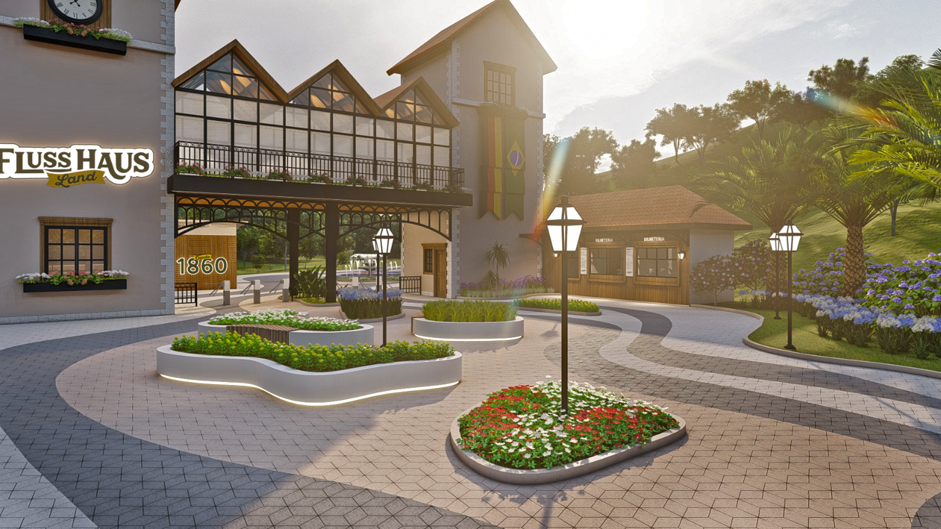 Criação de novo pórtico de acesso, estacionamento para carros, motos e ônibus, capela, palco e praça central para apresentações, readequação dos caminhos e espaços externos para se tornarem acessíveis, reforma de espaços internos, paisagismo de todo parque.