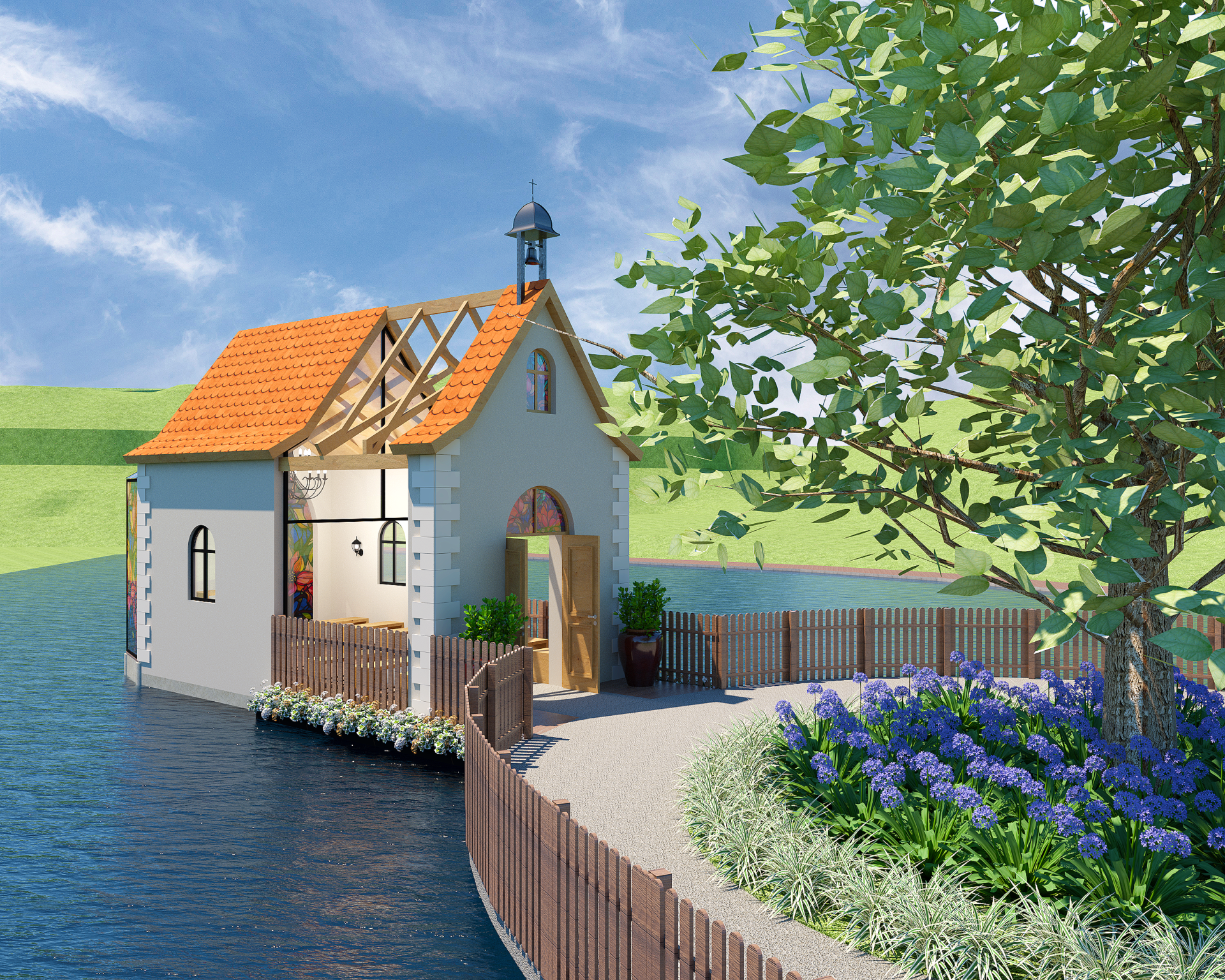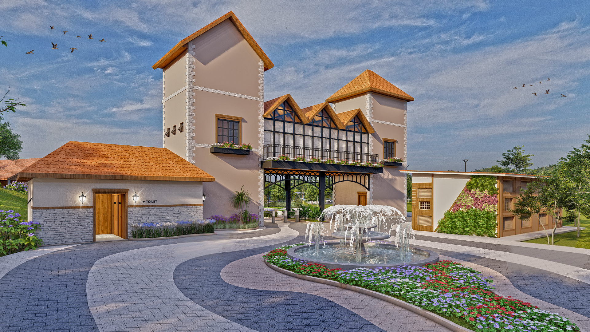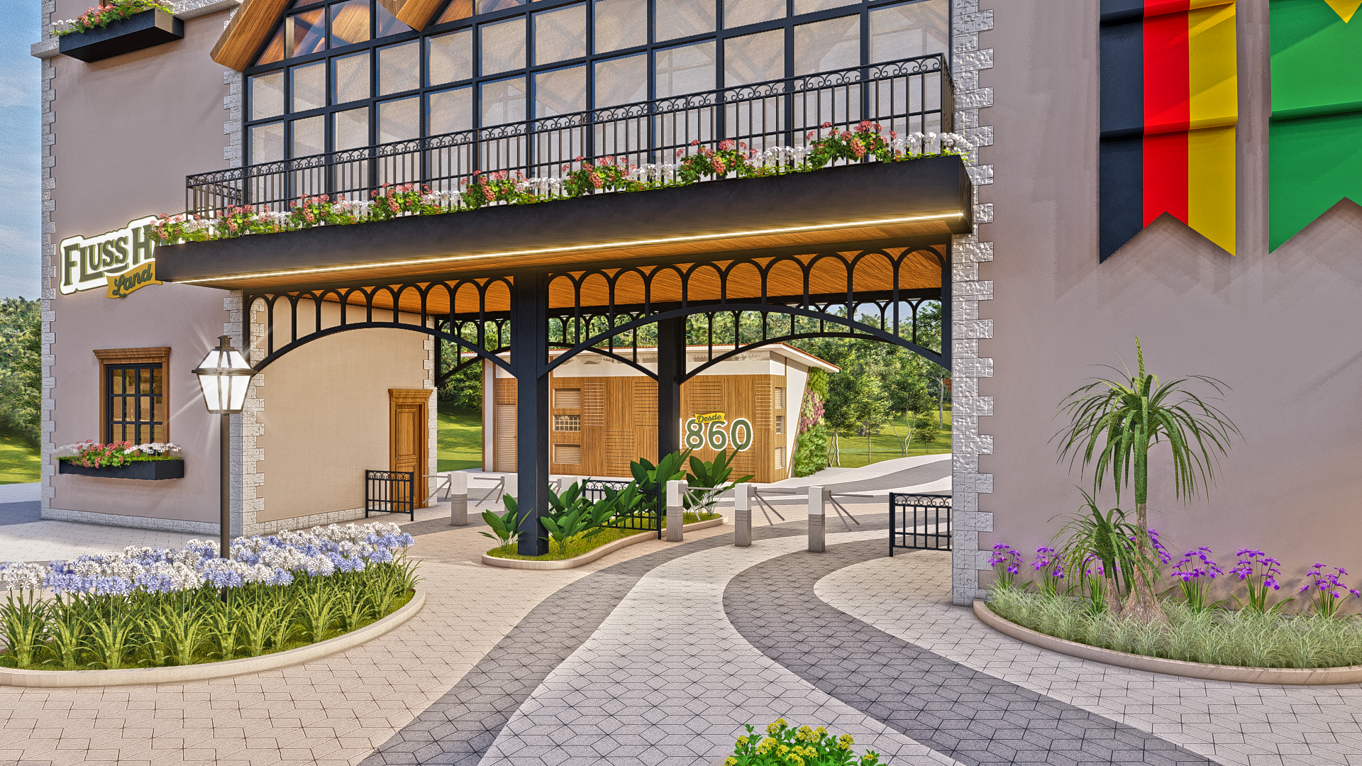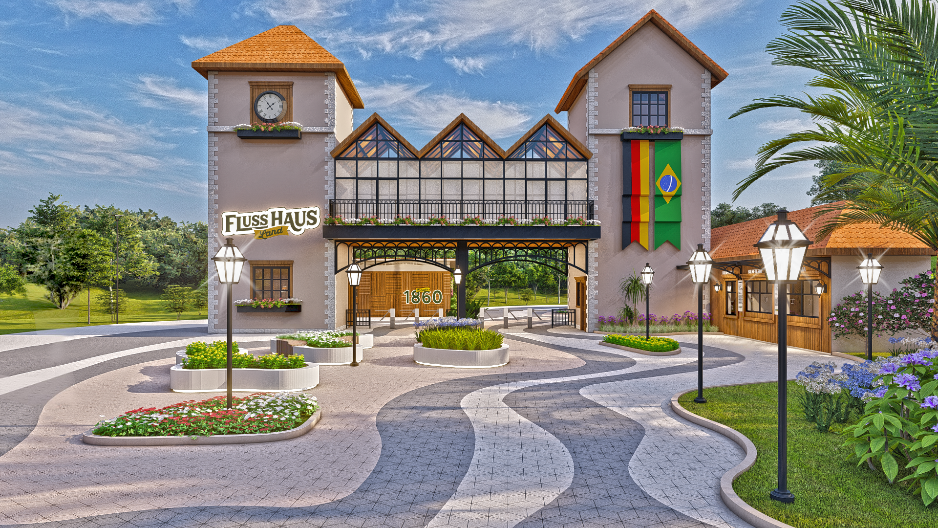 Transformação da fábrica de bolachas e chocolates artesanais Fluss Haus no parque temático alemão Fluss Haus Land.